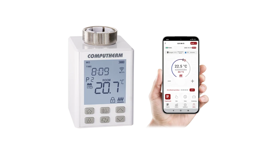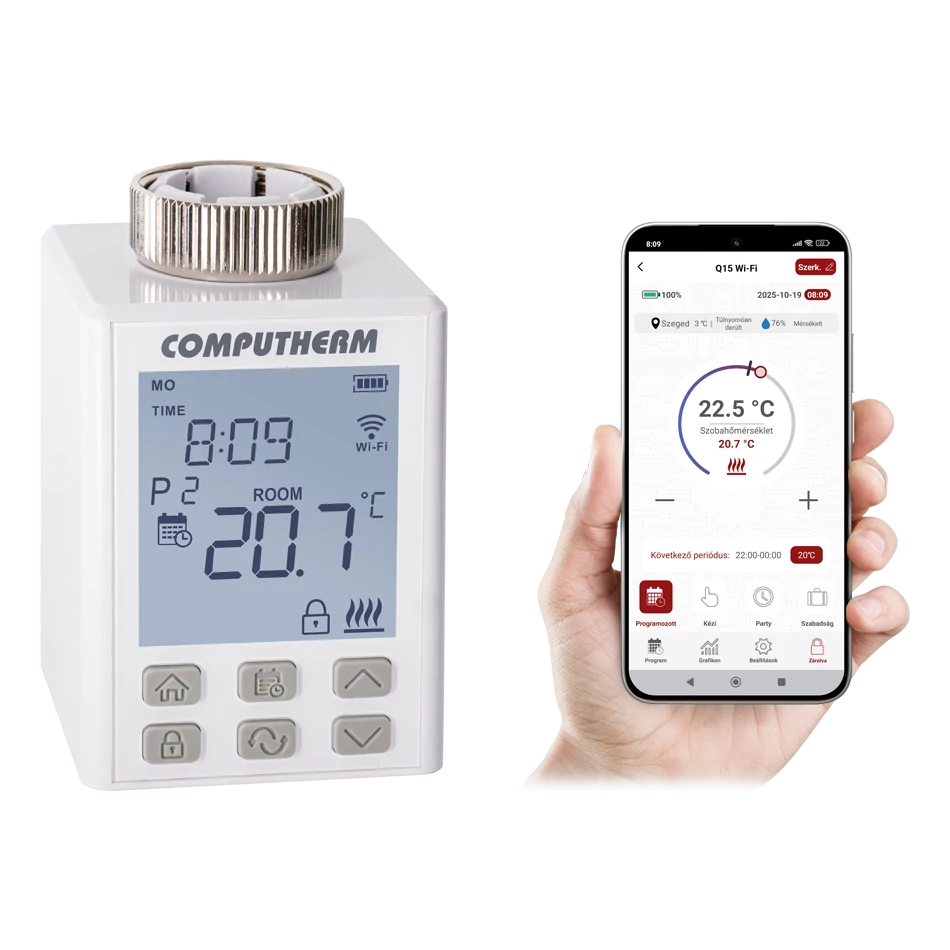 A COMPUTHERM Q15 Wi-Fi egy radiátorszelepek vezérlésére szolgáló programozható motoros állítómű. Az állítómű csatlakozó hollandi (valamint a mellékelt átalakítók) segítségével radiátorszelepre szerelve annak nyitását/zárását biztosítja. Használata kifejezetten ajánlott olyan helyeken, ahol a fűtőkészülék közvetlenül nem vezérelhető, de mégis szükség van a helyiségek hőmérsékletének külön-külön szabályozására, növelve ezzel a komfortot és csökkentve az energiaköltségeket (pl. távfűtéses vagy körönként szelepállítóval szabályozható osztó-gyűjtő nélküli lakások). Az állítómű egyéni igény szerint beprogramozható úgy, hogy az Ön által kívánt időpontokban tetszés szerinti hőfokra fűtse az adott helyiséget, és a komfort biztosítása mellett hozzájáruljon az energiaköltségek csökkentéséhez.