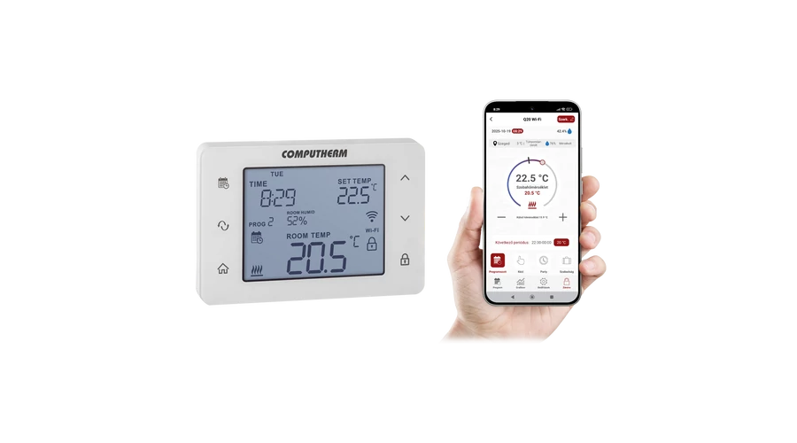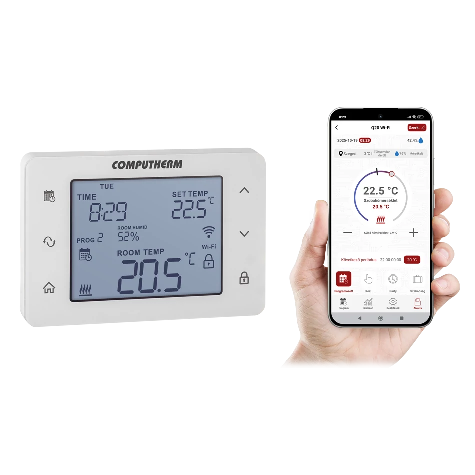 A COMPUTHERM Q20 Wi-Fi típusú kapcsoló üzemű szobatermosztát a Magyarországon forgalomban lévő kazánok, klímaberendezések, párásító és párátlanító berendezések túlnyomó többségének szabályozására alkalmas. Egyszerűen csatlakoztatható bármely, kétvezetékes szobatermosztát csatlakozási ponttal rendelkező gázkazánhoz, klímaberendezéshez, párásító és párátlanító berendezéshez, valamint egyéb elektromos készülékhez függetlenül attól, hogy az 24 V-os vagy 230 V-os vezérlőáramkörrel rendelkezik. A készülék egyéni igény szerint beprogramozható úgy, hogy a fűtési/hűtési vagy a párásító/párátlanító rendszer az Ön által kívánt időpontokban tetszés szerinti hőfokra fűtse/hűtse vagy páratartalomra párásítsa/párátlanítsa lakását vagy irodáját, és a komfort biztosítása mellett hozzájáruljon az energiaköltségek csökkentéséhez. A készülék interneten keresztül és az érintőgombos kezelőfelületen is egyszerűen vezérelhető, annak működési állapota folyamatosan ellenőrizhető.