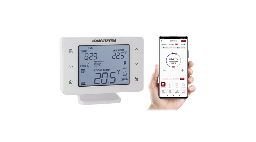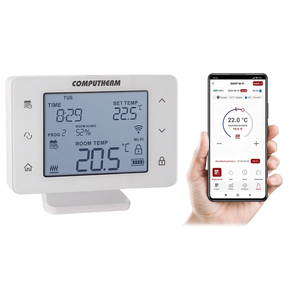 A COMPUTHERM Q20RF Wi-Fi (TX) típusú kapcsoló üzemű szobatermosztát a Magyarországon forgalomban lévő kazánok, klímaberendezések, párásító és párátlanító berendezések túlnyomó többségének szabályozására alkalmas. Egyszerűen csatlakoztatható bármely, kétvezetékes szobatermosztát csatlakozási ponttal rendelkező gázkazánhoz, klímaberendezéshez, párásító és párátlanító berendezéshez, valamint egyéb elektromos készülékhez függetlenül attól, hogy az 24 V-os vagy 230 V-os vezérlőáramkörrel rendelkezik. A készülék egyéni igény szerint beprogramozható úgy, hogy a fűtési/hűtési vagy a párásító/párátlanító rendszer az Ön által kívánt időpontokban tetszés szerinti hőfokra fűtse/hűtse vagy páratartalomra párásítsa/párátlanítsa lakását vagy irodáját, és a komfort biztosítása mellett hozzájáruljon az energiaköltségek csökkentéséhez. A készülék interneten keresztül és az érintőgombos kezelőfelületen is egyszerűen vezérelhető, annak működési állapota folyamatosan ellenőrizhető.